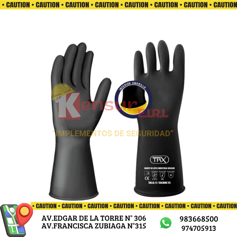 El guante de LÁTEX INDUSTRIAL BICOLOR de la marca TRX es un equipo de protección personal diseñado para trabajo pesado. Fabricado con látex natural de alta calidad, presenta un diseño ergonómico que minimiza la fatiga de las manos durante su uso prolongado. Su doble capa (interna amarilla y externa negra) optimiza la resistencia y ofrece máxima protección en actividades industriales y domésticas. Cuenta con un borde enrollado para evitar la entrada de sustancias al interior del guante y un acabado texturizado para un excelente agarre en condiciones húmedas y secas.